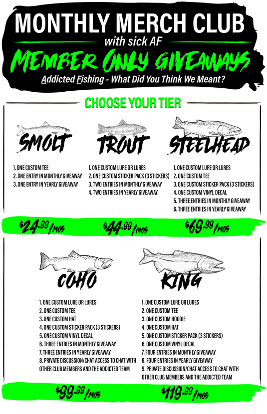 Every month you stay subscribed earns you more chances to win, and more exclusive gear to rep Addicted Fishing on the water or out on the town.